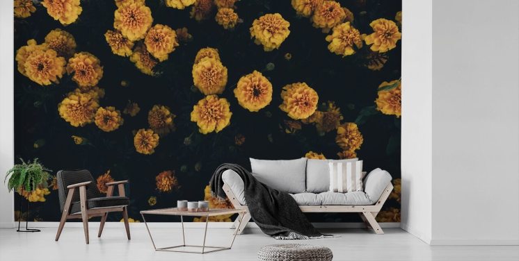 lyse oransje nellik blomster med lilla og grønt løvverk på en mørk bakgrunn tapet