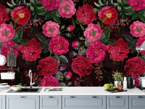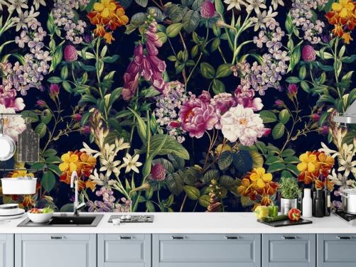 vintage eksotiske peoner og tropiske frukter natt hage tapet