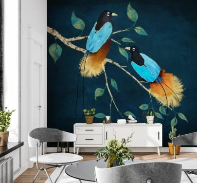Blå og gull fugler på en gren med grønne blader på en mørk blå bakgrunn