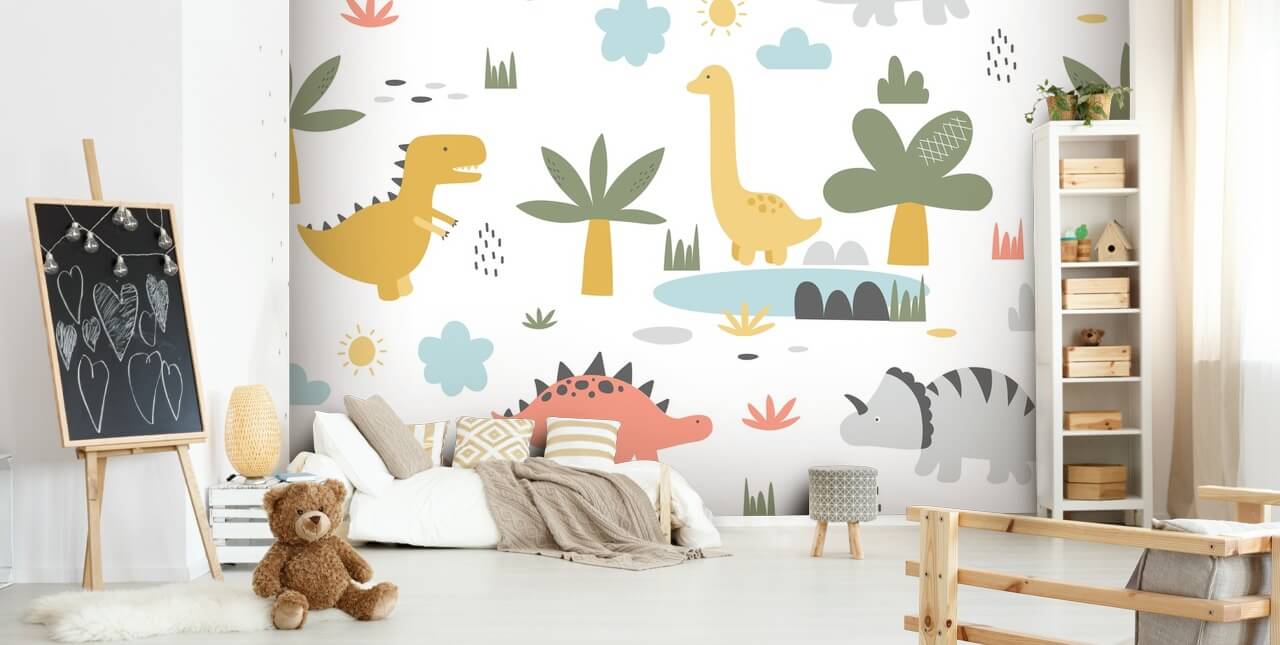Hvis du vil ha et søtt dino tapet til babyens barnehage eller barns soverom, velger du dette søte Dinosaur Trio-tapetet. Viser tre arter av dinosaurer, vil denne tegneserie tapet lære babyen din om dinosaurer fra en ung alder!