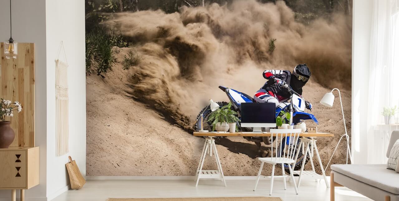 Ta med den rå energien fra skitsykling inn i rommet ditt med vårt Dirt Bike Dust tapetmaleri.