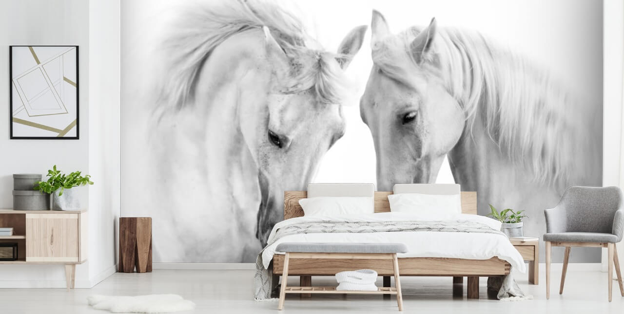 Pynt veggen din med dette helt vakre Dream Horses veggmaleriet. Er du en hesteelsker eller bare vil du ha et slående veggmaleri for å skape en drømmende, stilig atmosfære i hjemmet ditt? Da er dette hvite hestetapetet noe for deg.
