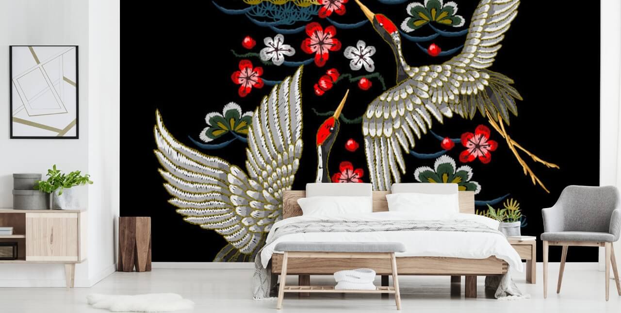 Mørk, orientalsk og slående, denne vakre Broderte japanske kraner tapet vil gjøre en fantastisk funksjon vegg i alle rom! Vi tror at dette mørke orientalske tapetet ville se fantastisk ut i et romantisk soverom! I stedet for å plassere den over sengen, hvorfor ikke installere dette designet på hver side av et skorsteinbryst slik at de speiler hverandre? Mal veggene i gull metallisk maling og har en rekke off-white, svart, rød og gull rom tilbehør hele.