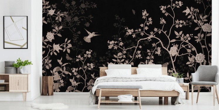 mørkt tilpassbart naturveggmaleri kalt Velaria II av Loris Drago for soverom og ganger