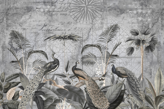 grå illustrert påfugler tapetveggmaleri kalt Peacocks Clan 4 av Andrea Haase for soverom og stuer