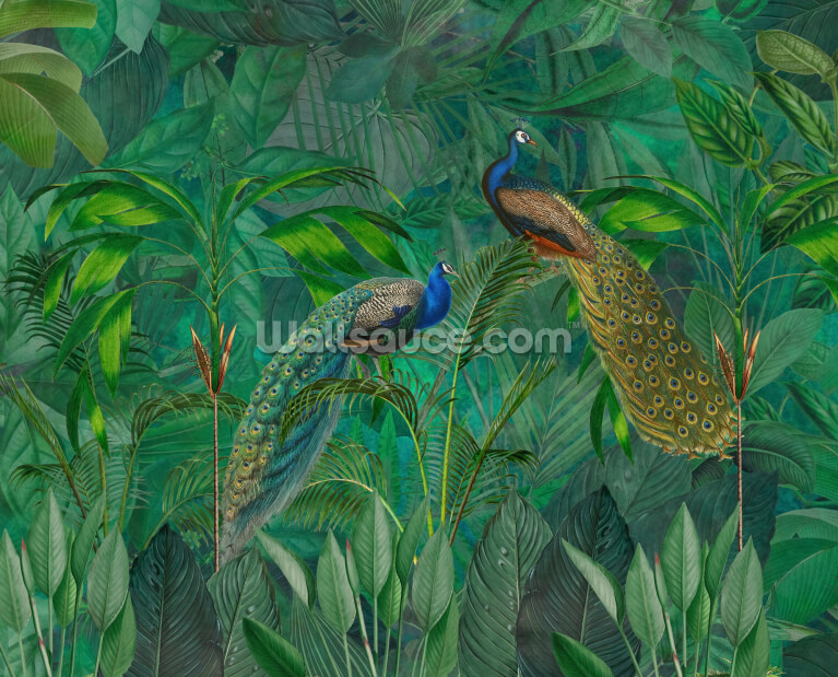 grønt tilpasset påfugl tapet kalt Peacock Paradise Jungle av Andrea Haase for soverom eller stue