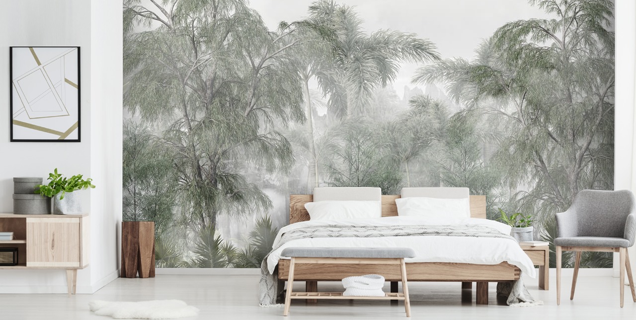 Bruk dette nydelige Lazy Canopy veggmaleriet som bakgrunn for din mørkegrønne sofa med synlige treben. Velg et salongbord som passer til de mørke trebenene på sofaen din, og legg det på toppen av et tykt, grønt teppe. For de gjenværende veggene dine, mal dem lysegrå, men pryder dem med trehyller for å vise ornamenter eller bøker du måtte ha.