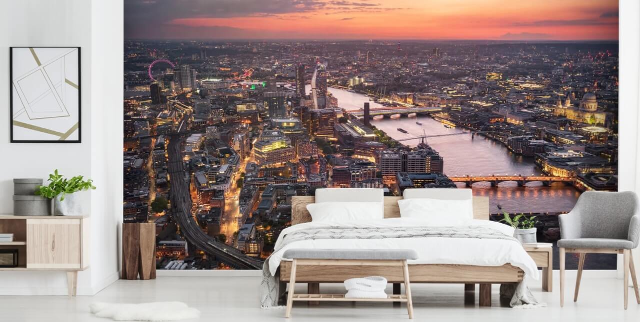 Hvis du vil ha et slående bylandskap for soverommet ditt, velger du dette London Sunset Aerial View tapet.