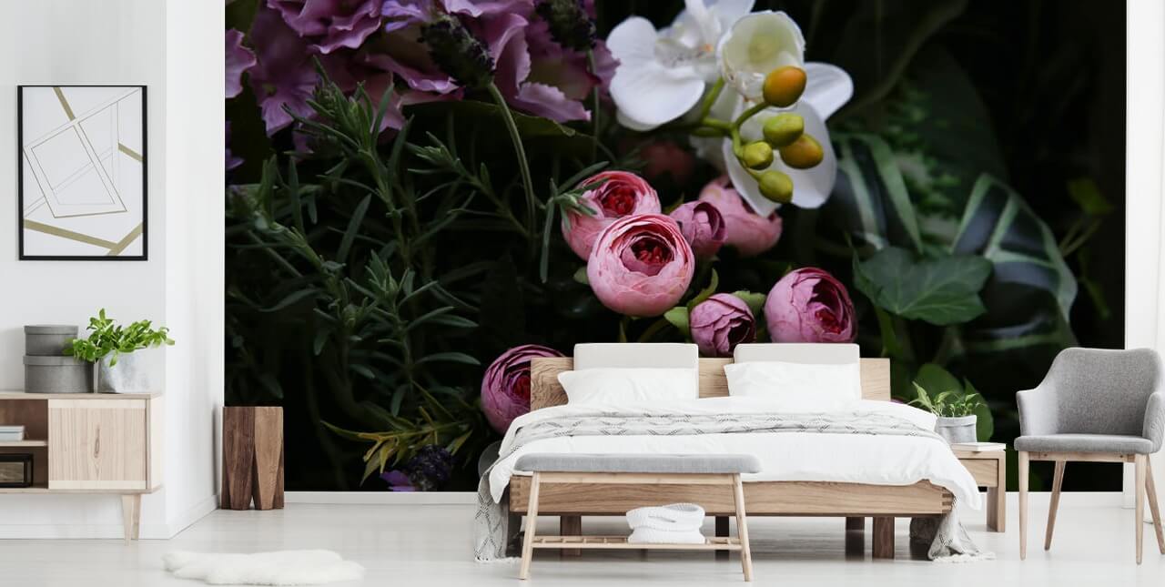 Denne fantastiske mørke floral tapet ville se fantastisk med en lys nyanse av rosa, grønn eller grå maling på de omkringliggende veggene. Velg knuste fløyelsrosa puter og myke kast for å skape den perfekte, koselige følelsen i rommet ditt.