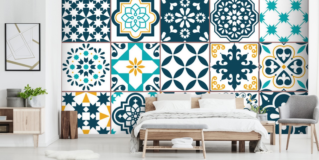 Navy og sennep er en fantastisk fargekombinasjon og ser fantastisk ut i de fleste oppholdsrom. Installer denne nydelige tyrkiske fliser tapet i salongen bak sofaen din. Eller, hvis du har en peis med alkover, installer dette nydelige mønsteret i alkovene og la peisveggen din være upapered. Du kan til og med male peisen i en nyanse av sennep eller marine for å virkelig gjøre flis-effekt veggmaleri pop!