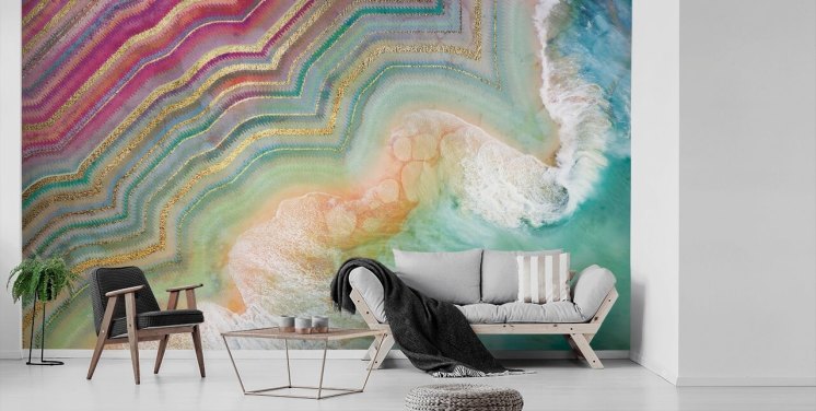rosa, blå og grønn tonet marmor effekt tapet