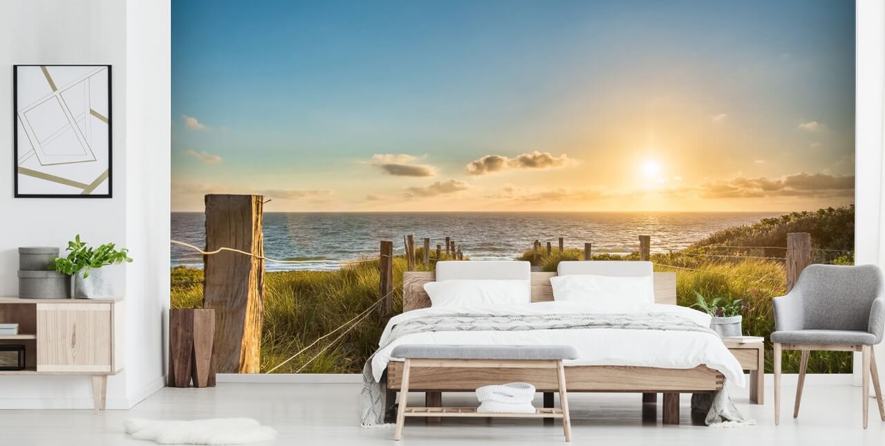 Rolig, vakker og rolig, det er virkelig ikke noe å ikke like med dette nydelige veggmaleriet Veien til havet. Med milde gyldne toner fra solnedgangen, den milde hvite sanden og roen i det fjerne havvannet, tror vi dette beroligende strandtapetet ville være perfekt for et soverom.