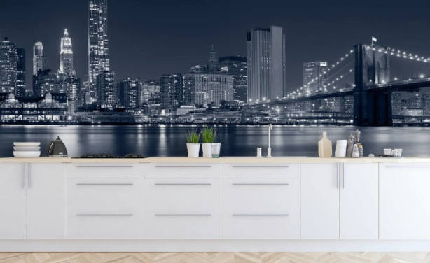 svart og hvitt tilpasset New York City tapetmaleri kalt Manhattan at Night for stuer, kontorer og soverom