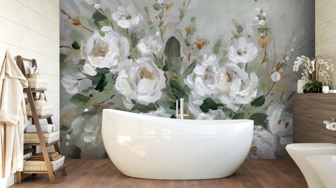 hvitt og blått tilpassbart blomstertapet veggmaleri kalt Glorious Ginko av Carol Robinson for bad og soverom