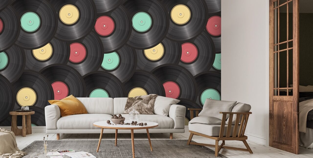 Vinyl Records Wallpaper Mural fra Wallsauce, ta den musikalske kanten til prosjektet ditt. alle Custom Made til dine målinger av wallsauce