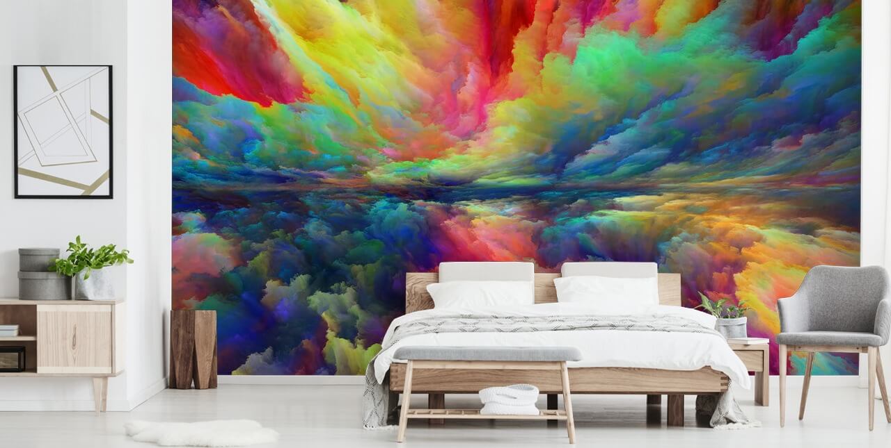 Akkurat som skyer av farger, vil dette landskapet laget av regnbuer skape en lunefull og hypnotisk atmosfære i alle rom! For å bestille dette abstrakte tapetet, bare ring oss eller fyll ut bestillingsskjemaet på denne siden.