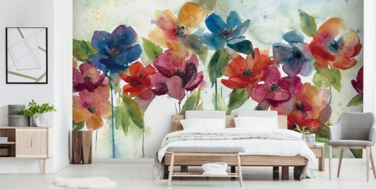 rød oransje og blå tilpassbar blomstertapet veggmaleri kalt Flower Dance av Carol Robinson for stuen