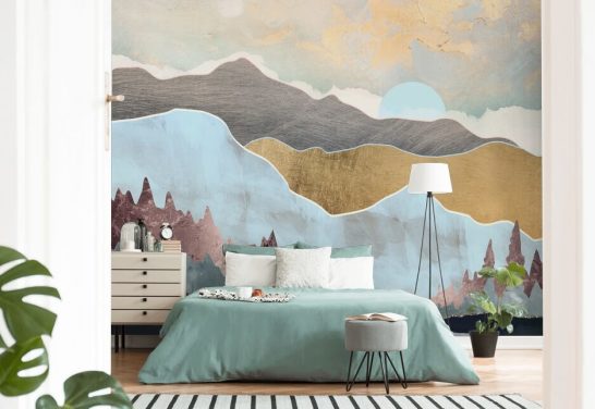 indigo og blått tilpasset tapetmaleri kalt Indigo Mountains av SpaceFrog Designs for stuer