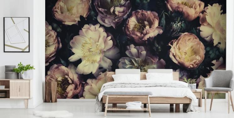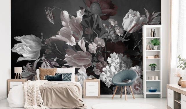 mørkeblått og hvitt blomstertapet veggmaleri kalt Midnight Bouquet av Uta Naumann for soverom