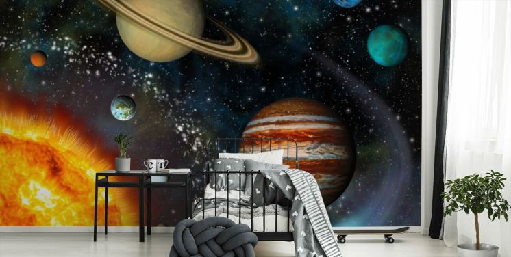 tilpassbart romtapetveggmaleri kalt Space Odyssey av Adrian Chesterman for barnets soverom