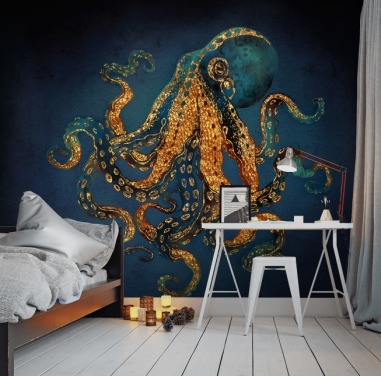 marineblå og gull tilpassbar blekksprut tapetmaleri kalt Underwater Dream IV av SpaceFrog Designs for bad