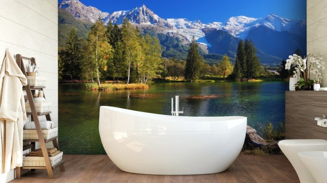 blå og grønn tilpassbar innsjø tapet kalt Snow Capped Mountains for soverom eller kontor