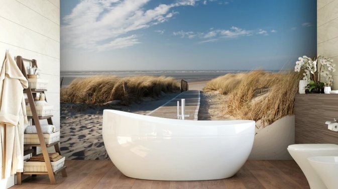 blått og gull tilpassbart strandtapet veggmaleri kalt WindBeach Boardwalk for spisestuer eller kjøkken