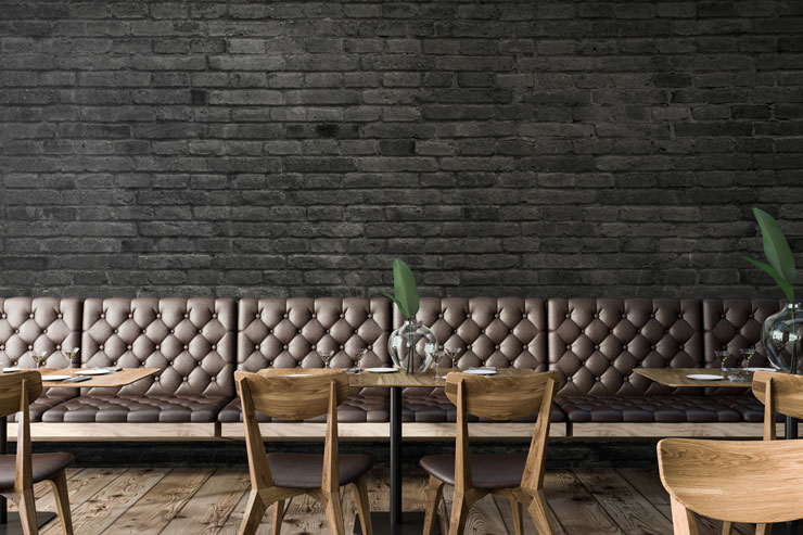 painted black bricks wallpaper in restaurant with leather studded chairs and wooden tables
