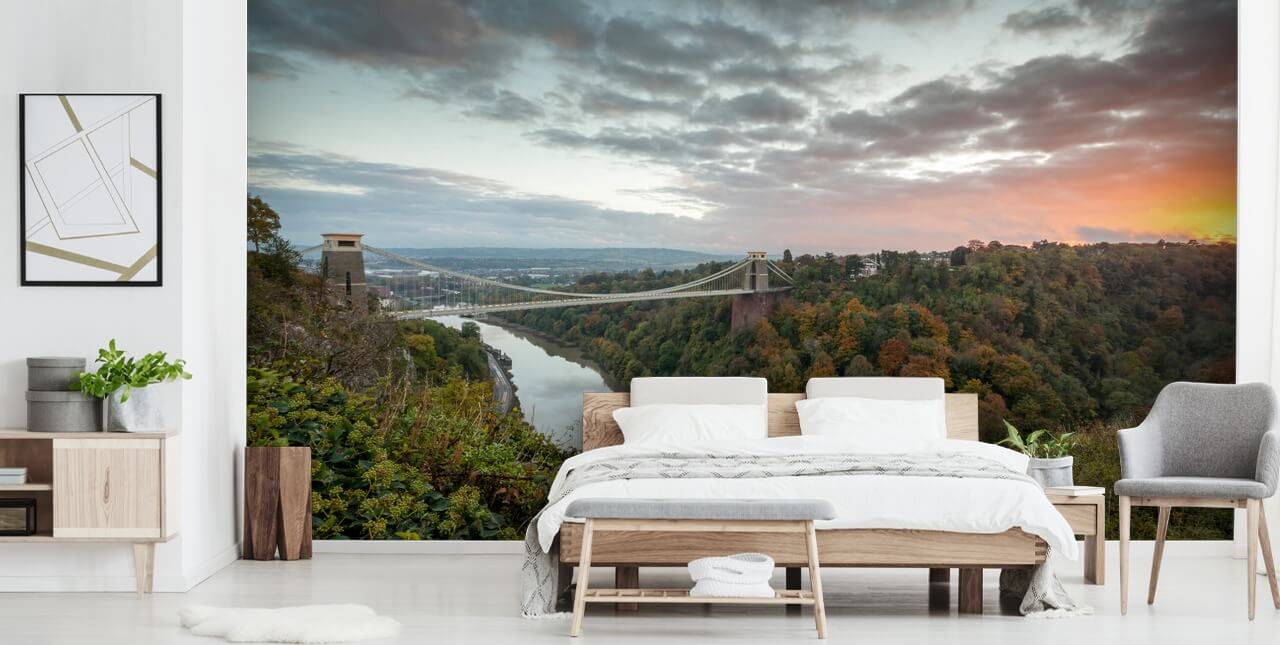 Bring an autumnal feel into your home with this gorgeous Clifton Suspension Bridge Bristol wall mural. We love the dramatic sunset sky and the trees which are just starting to turn a shade of orange… It really is the perfect English autumn wallpaper.