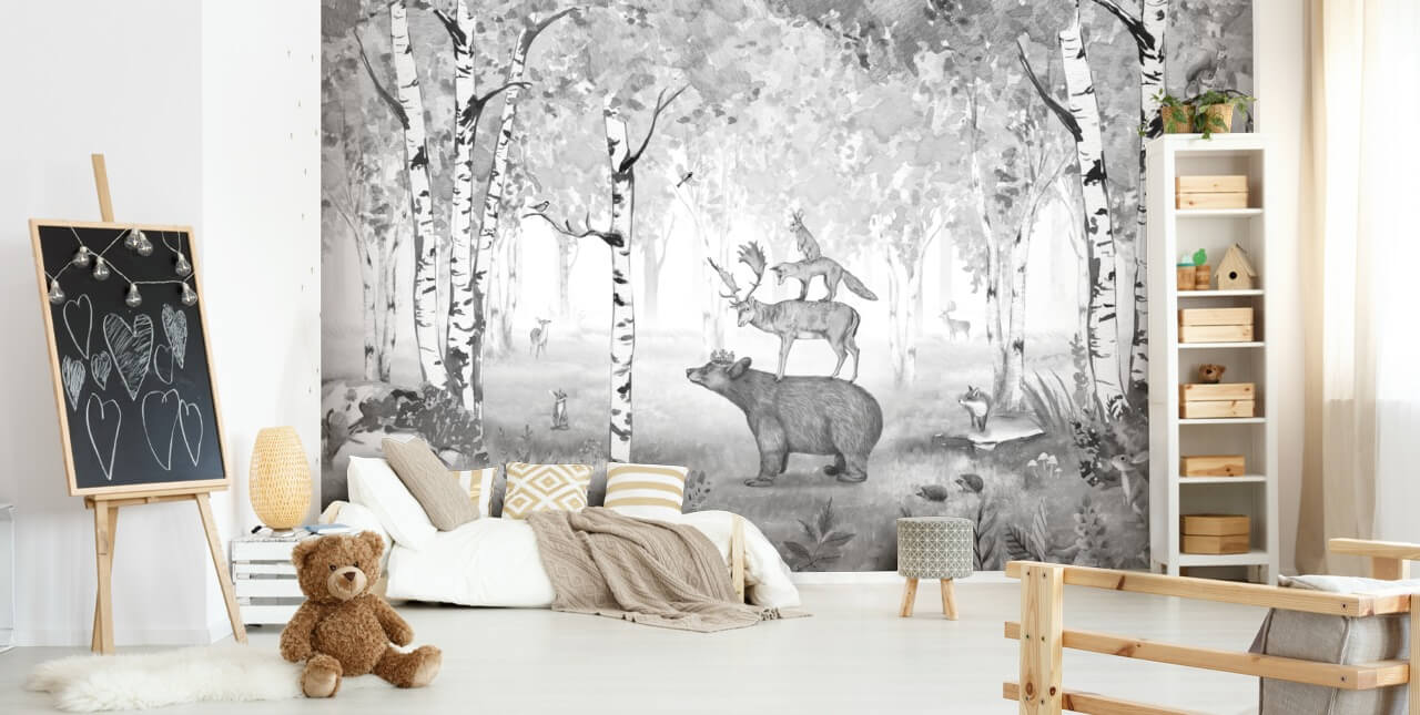 Create an adorable feature wall in your baby’s nursery with this made-to-measure Bear King Black and White wallpaper designed by Kikki Belle. This cute animal wallpaper would look amazing paired with off-white, grey and black room accessories and décor.