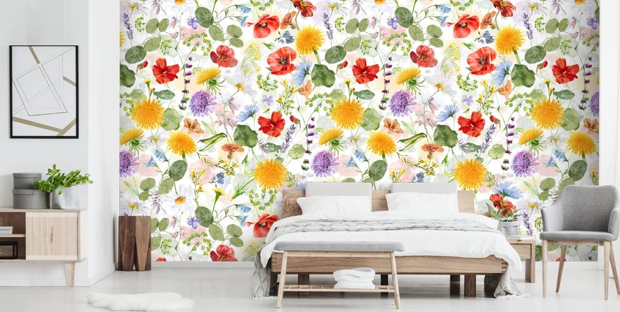 If you want to create a cheerful feature wall in a bedroom, living room, kitchen and more, then choose this beautiful Colourful Wildflowers Meadow wall mural.