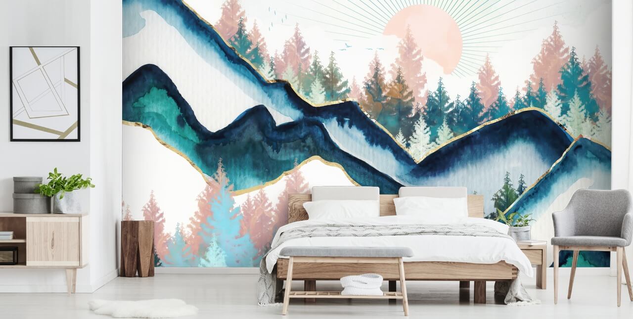 Enjoy watercolour mountains in your home with this custom-made Pastel Winter Forest wallpaper by SpaceFrog Designs.