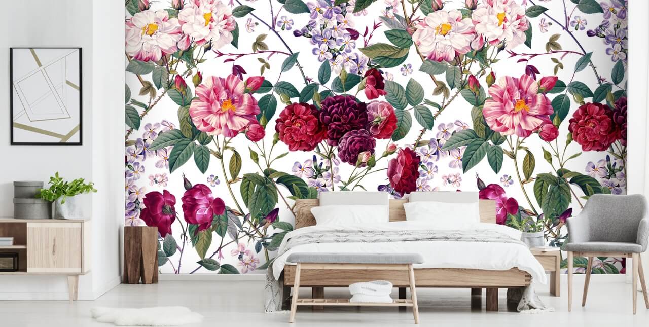Embrace the pink, green, purple and lilac tones in this Thorns and Roses wallpaper by choosing room accessories in similar shades. A purple blanket to place on the end of the bed, a vase of pink roses placed on the windowsill and white painted walls to balance it all out.
