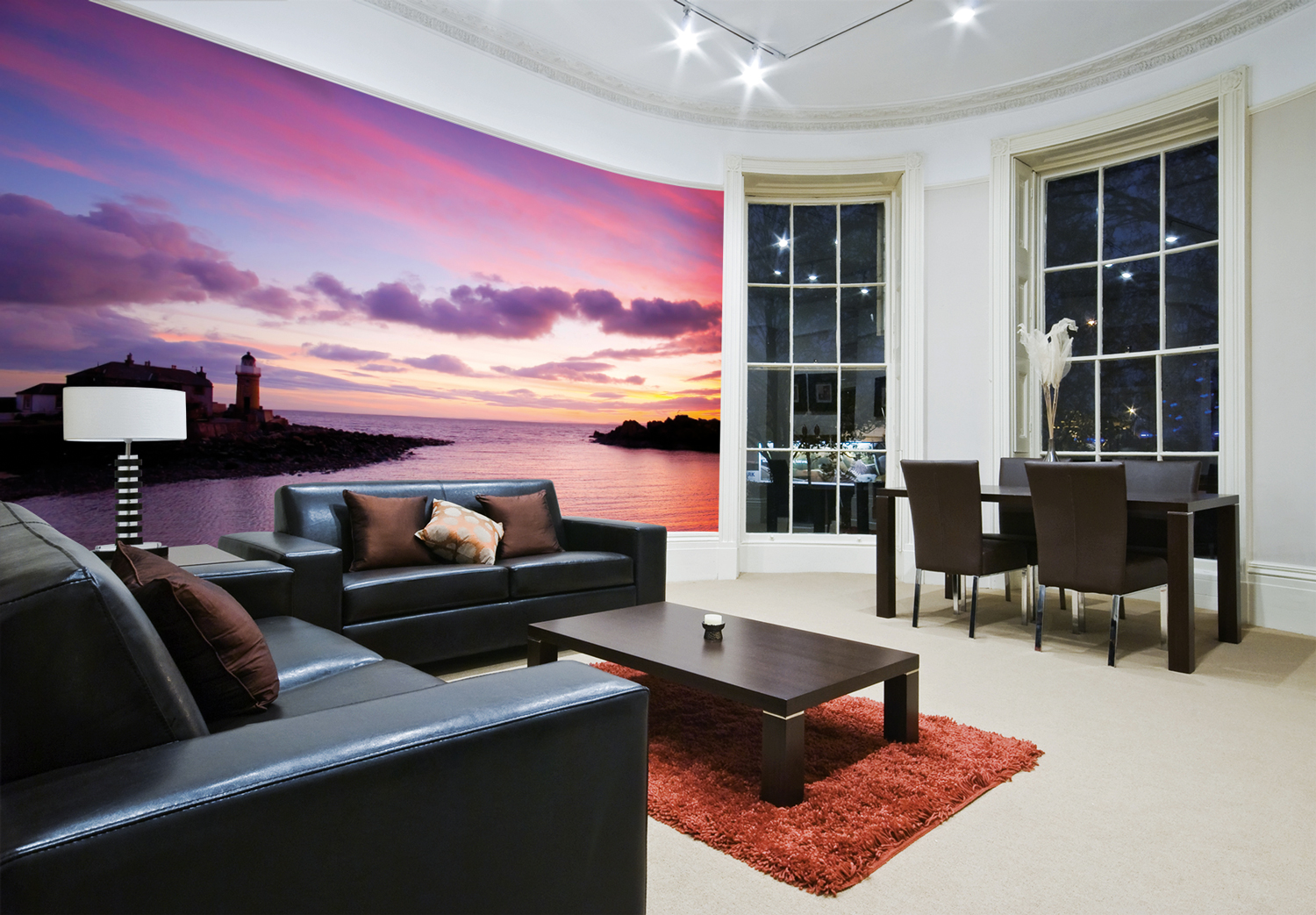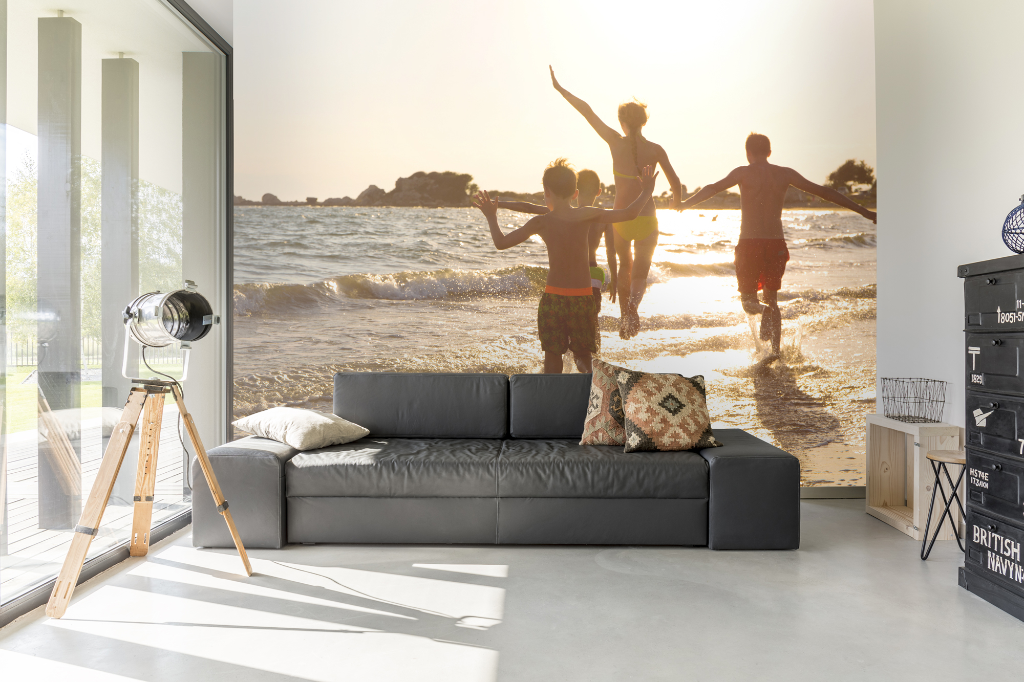 Lighting is also an easy yet impactful way to create a great family atmosphere and add to the quality of your decor without breaking the bank. Have lighting that can provide softer light for chilled out evenings. A simple lamp, sconce or dimmer switch will do this. The mural below from the Phil McMenemy collection creates a wonderful and calming atmosphere that can make a small family room feel a lot larger than it is, as it draws the eye outwards.