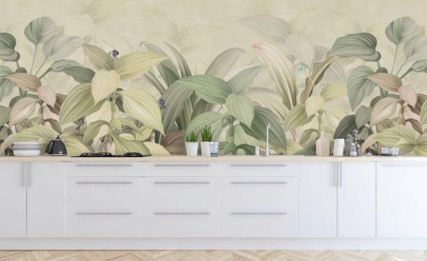 green customisable leaf wallpaper mural called Tropical Landscape by Andrea Haase for lounges