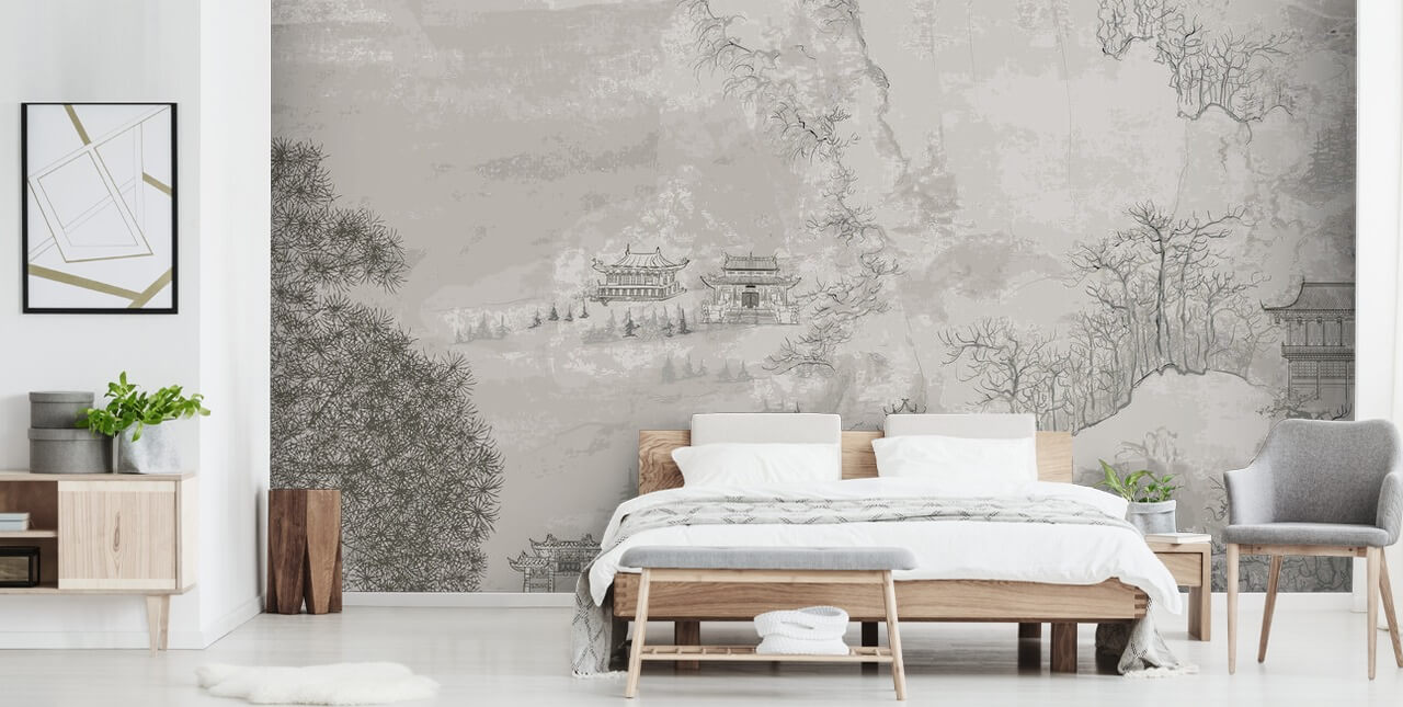 Landscape, China - Grey Oriental Wallpaper