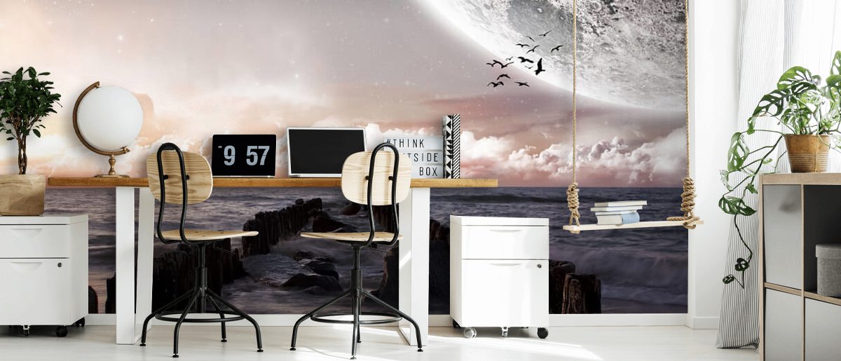 Step into a dreamlike world with this calming Planet Landscape from a Beach wall mural. Abundant with relaxing shades of lilac and blue, this serene moon wallpaper would be perfect for your master bedroom.