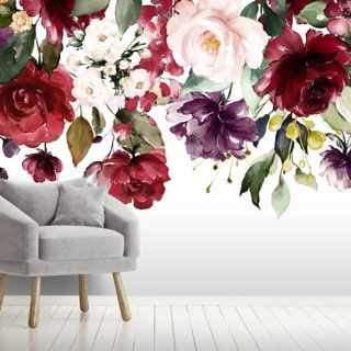 maroon floral wallpaper called Flower Chandelier for bedrooms, living rooms and dining rooms