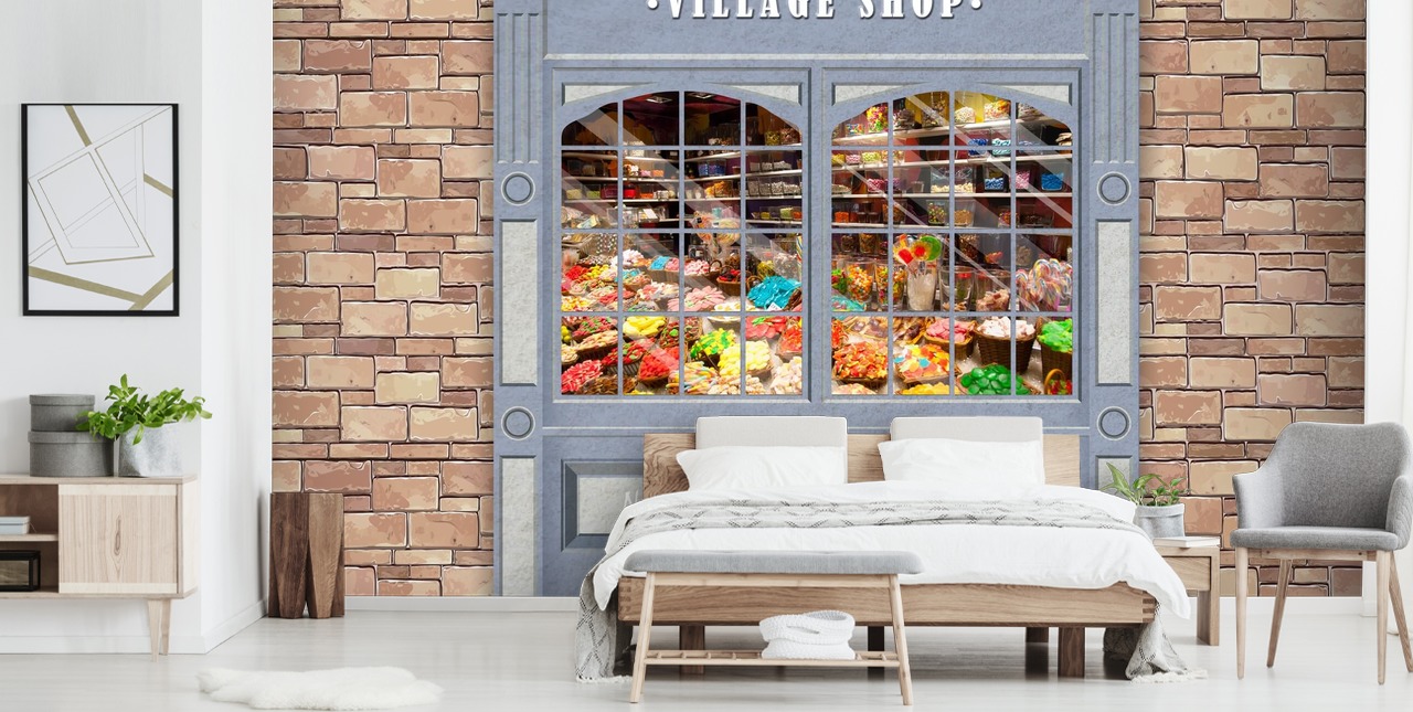 Stunning Village Shop wall mural from Wallsauce. This high quality care home wallpaper is custom made to your dimensions.