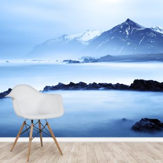 light blue and gold customisable mountain wallpaper mural called Winter Light by SpaceFrog Designs