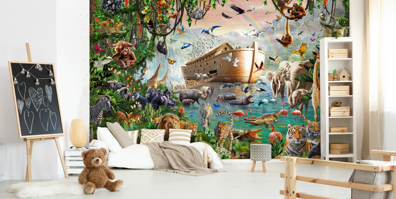 Todos os animais do mundo chegaram à arca, dois a dois. Mostrando como seria o paraíso, este papel de parede é perfeito para uma sala de jogos e para ensinar a seu filho tudo sobre a Arca de Noé.