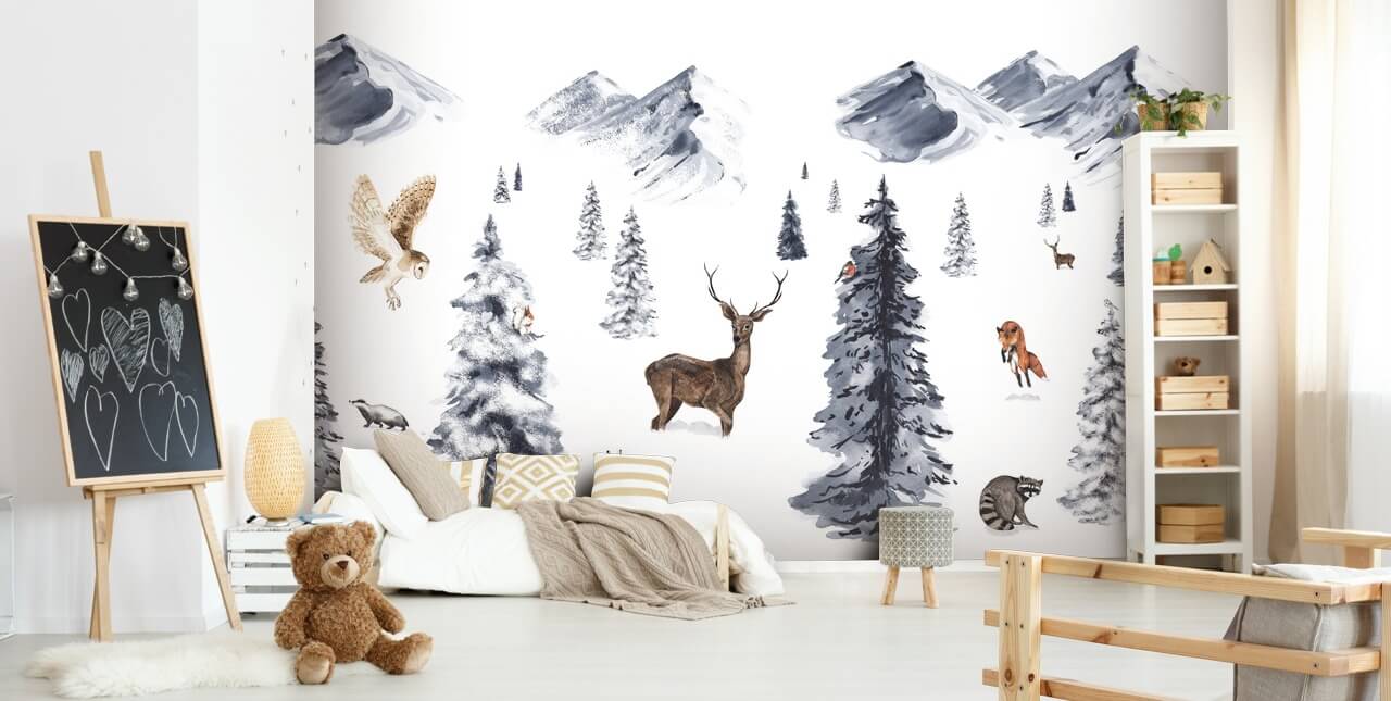 Transforme o berçário do seu bebê com este papel de parede Animal Winter Wonderland feito sob medida.