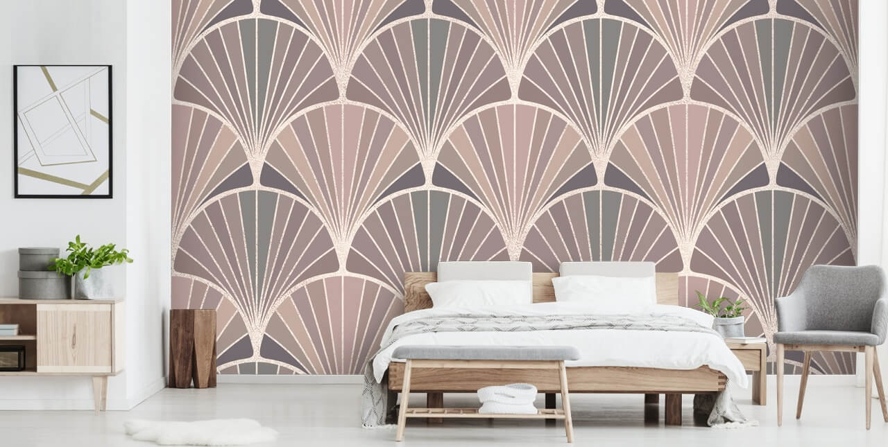Use este impressionante papel de parede art déco como pano de fundo para sua cama de dossel. Coloque cortinas brancas voile sobre seus postes e adorne sua cama com lençóis rosa. Pinte as paredes restantes com um toque de creme e acessórios com itens de ouro rosa, como molduras e um grande espelho ornamentado. Para um belo toque final, coloque um vaso de vidro alto no chão e encha-o com juncos e penas altos e finos e galhos com efeito dourado com iluminação branca suave.