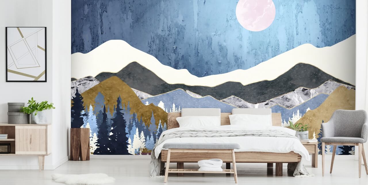 Traga tons suaves para a sua parede com este lindo mural de papel de parede Blueberry Sky criado pela SpaceFrog Designs. Adoramos a combinação de azul quase preto, verde oliva e até roxo neste papel de parede de montanha exclusivo.
