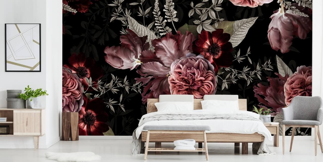 Ideal para um quarto principal ou boudoir, combine este fabuloso papel de parede floral escuro com uma variedade de acessórios de quarto rosa empoeirado e marrom. Imagine uma cabeceira de veludo rosa recortada para a cama e uma cadeira para combinar. Sem esquecer as capas de edredão rosa pastel com almofadas de dispersão rosa rubi colocadas no topo.