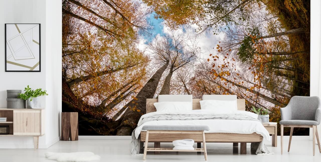 Por que não instalar este lindo papel de parede de árvore no teto do seu quarto para que você possa desfrutar dessa vista única enquanto se deita na cama. Destaque as cores outonais nesta floresta escolhendo uma decoração nos mesmos tons.