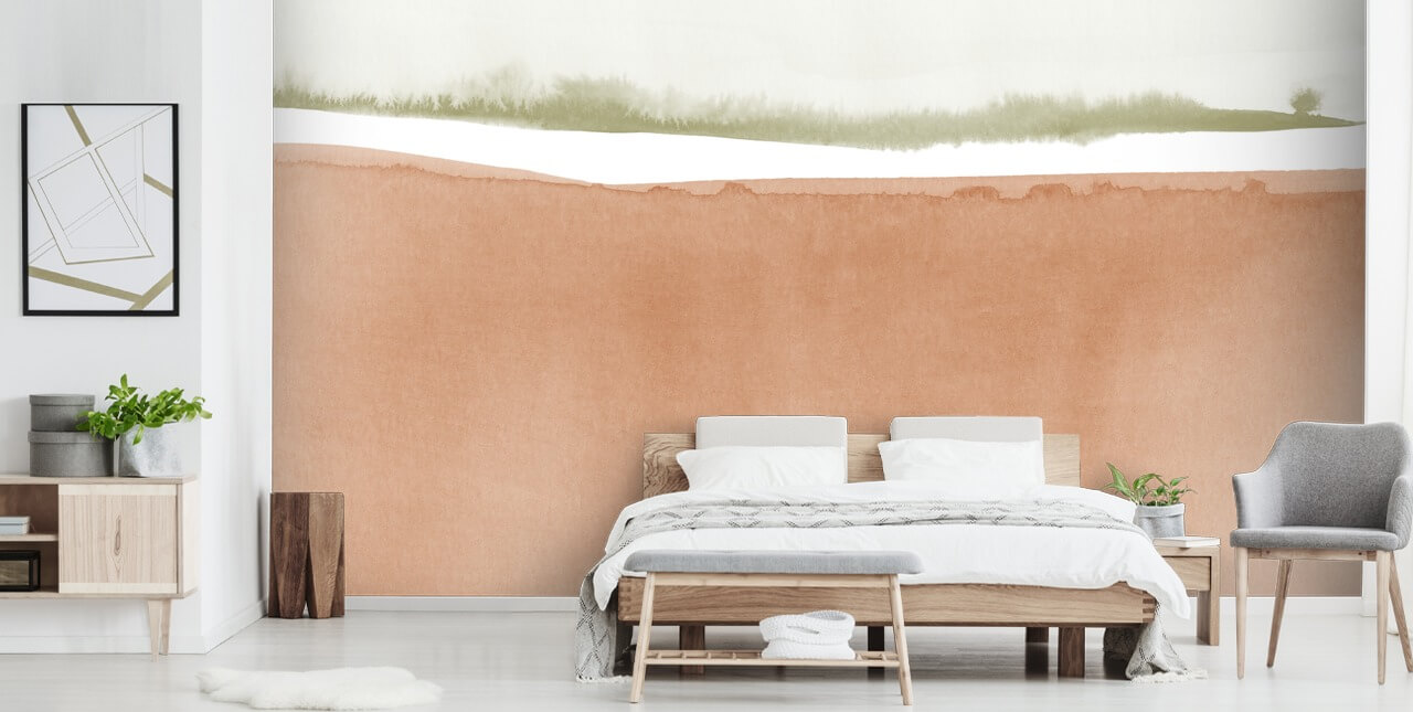 Coloque este papel de parede abstrato na parede do seu quarto e escolha roupas de cama em tons de terracota para espelhar as sombras desta pintura. Pinte as paredes de branco e tenha uma variedade de decoração natural, como um tapete circular de vime e uma cabeceira de vime na cama. Traga plantas verdes frondosas para espelhar o belo verde sálvia no papel de parede em aquarela.