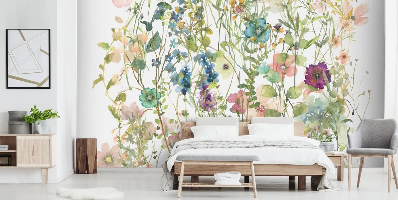 Este lindo papel de parede do Jardim Francês é a escolha perfeita para um lindo quarto principal. Escolha roupas de cama esbranquiçadas e almofadas dispersas em tons de rosa pastel e verde. Pinte as paredes circundantes de branco e escolha uma decoração de madeira clara para espelhar a sensação natural deste papel de parede floral.