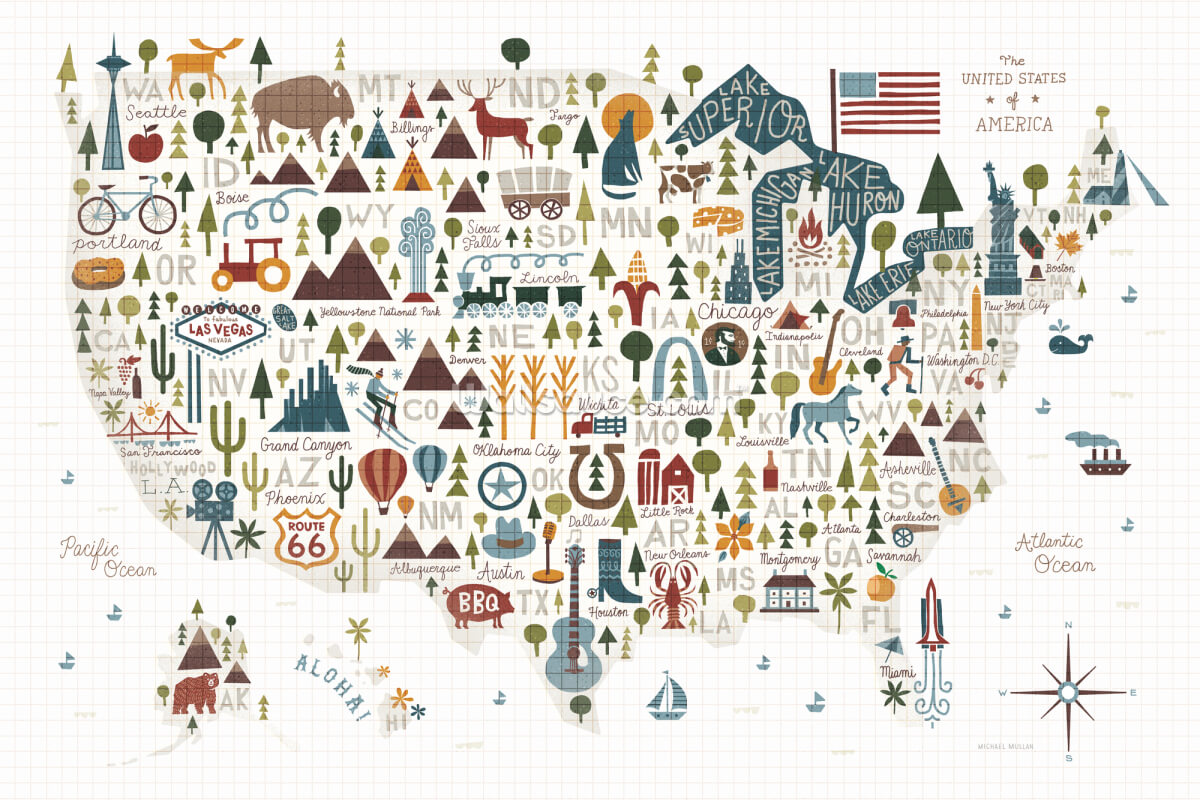 Traga a cultura da América do Norte para sua casa com este papel de parede Illustrated USA Map feito sob medida por Michael Mullan.