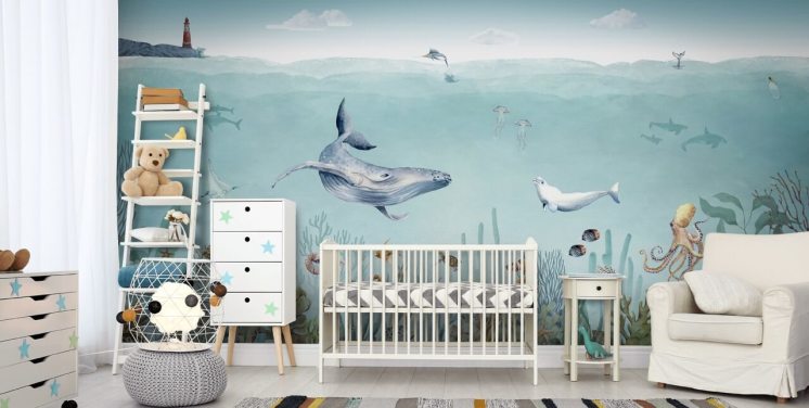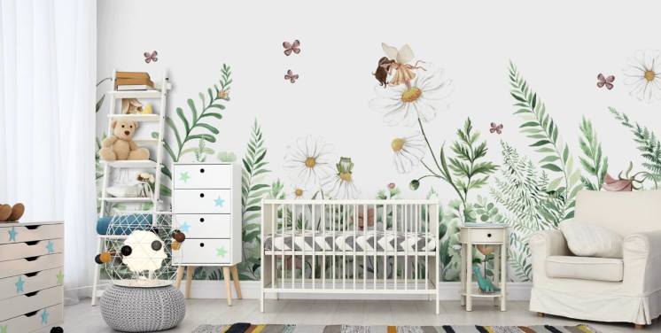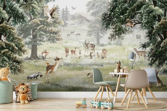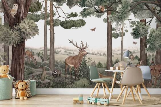 papel de parede ilustrado de bosques e criaturas para quarto de crianças